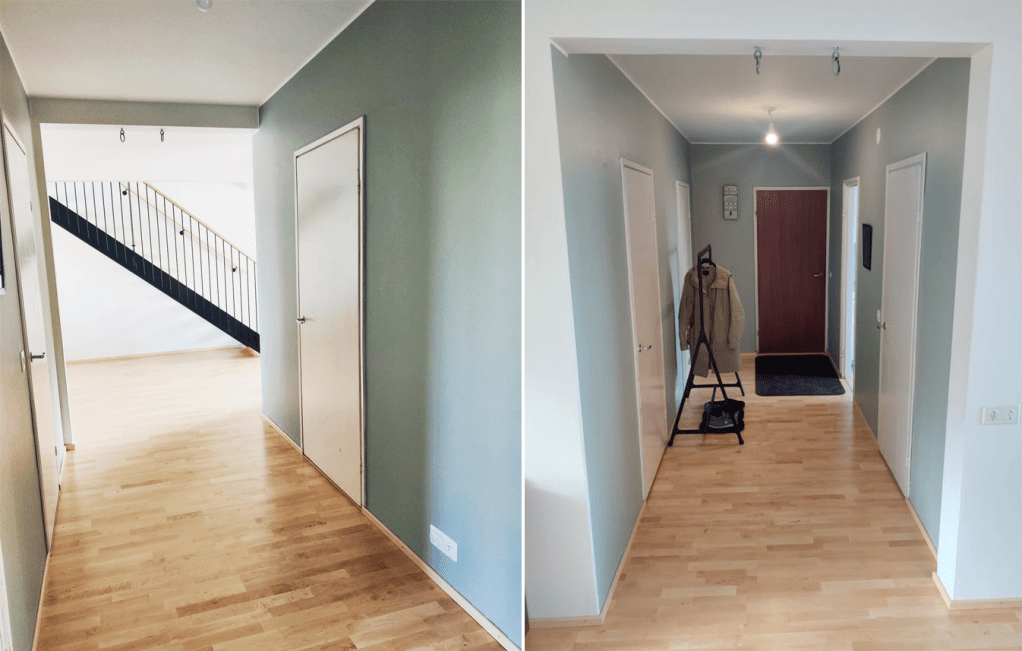 Valoisa tila ei automaattisesti tarkoita valkoista seinää. Tikkurilan Serpentiini tuo tähän käytävään syvyyttä, mutta pitää yleisilmeen raikkaana.