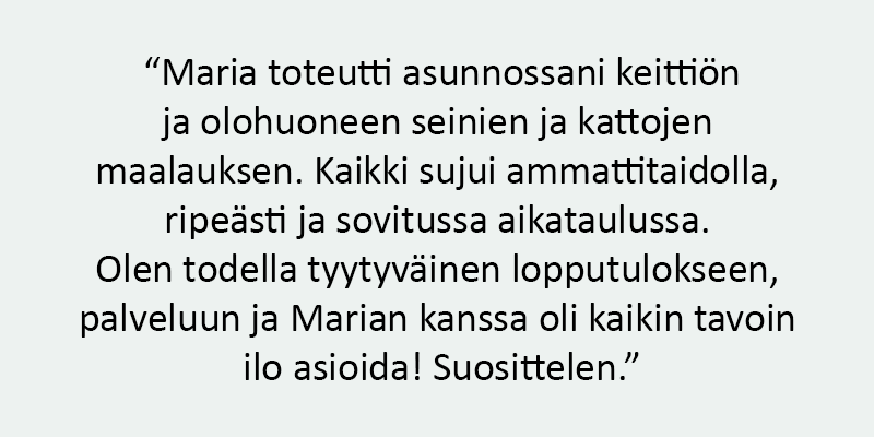 Valoraja on pääkaupunkiseudulla ja Keski-Uudellamaalla toimiva sisätilamaalaukseen erikoistunut maalauspalvelu. Myös ulkomaalaus, tapetointi, kuivien tilojen laatoitustyöt sekä huonekalujen pintakäsittelyt onnistuvat.
